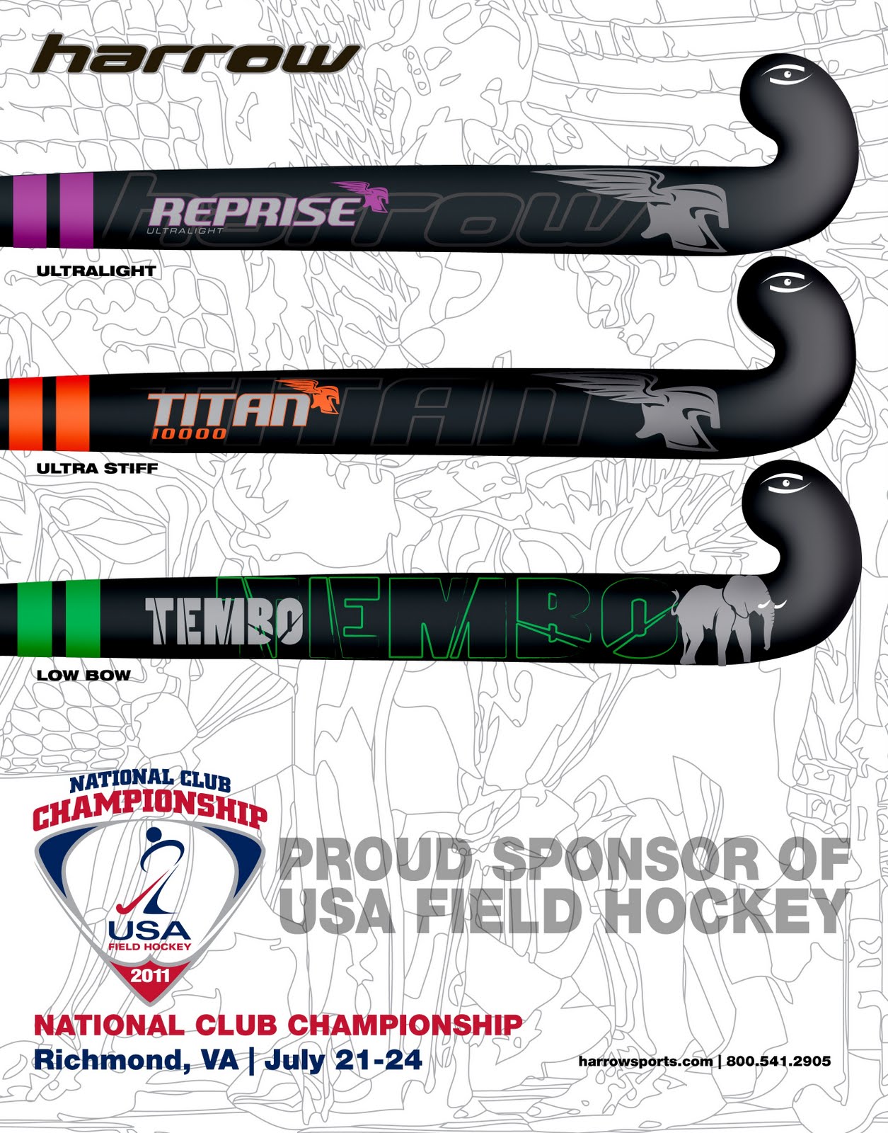 So the first annual National Club Championship will be held in Richmond, Virginia from 21, July 2011- 24, July 2011. Guess who the official sponsors of the event is? HARROW obviously. There will be a Harrow booth where you can get all your field hockey necessities. Harrow will be selling official event merchandise as well as showcasing the brand new stick line favored by Rachel Dawson in the recent Champions Challenge.